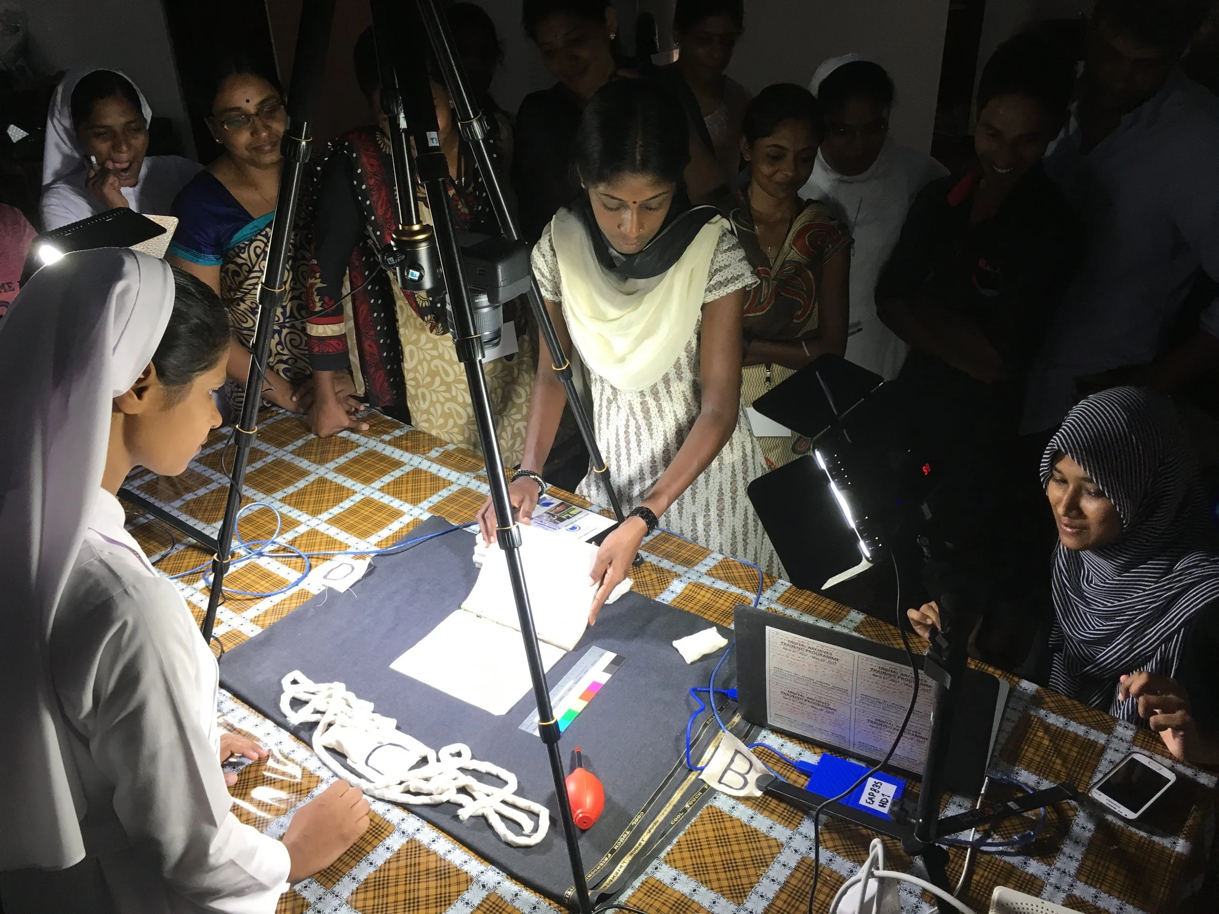 Kirubalini Stephan (center) leading a digitization demonstration during our two-month training program for university students and Jaffna librarians. Photo Credit: Mark E. Balmforth