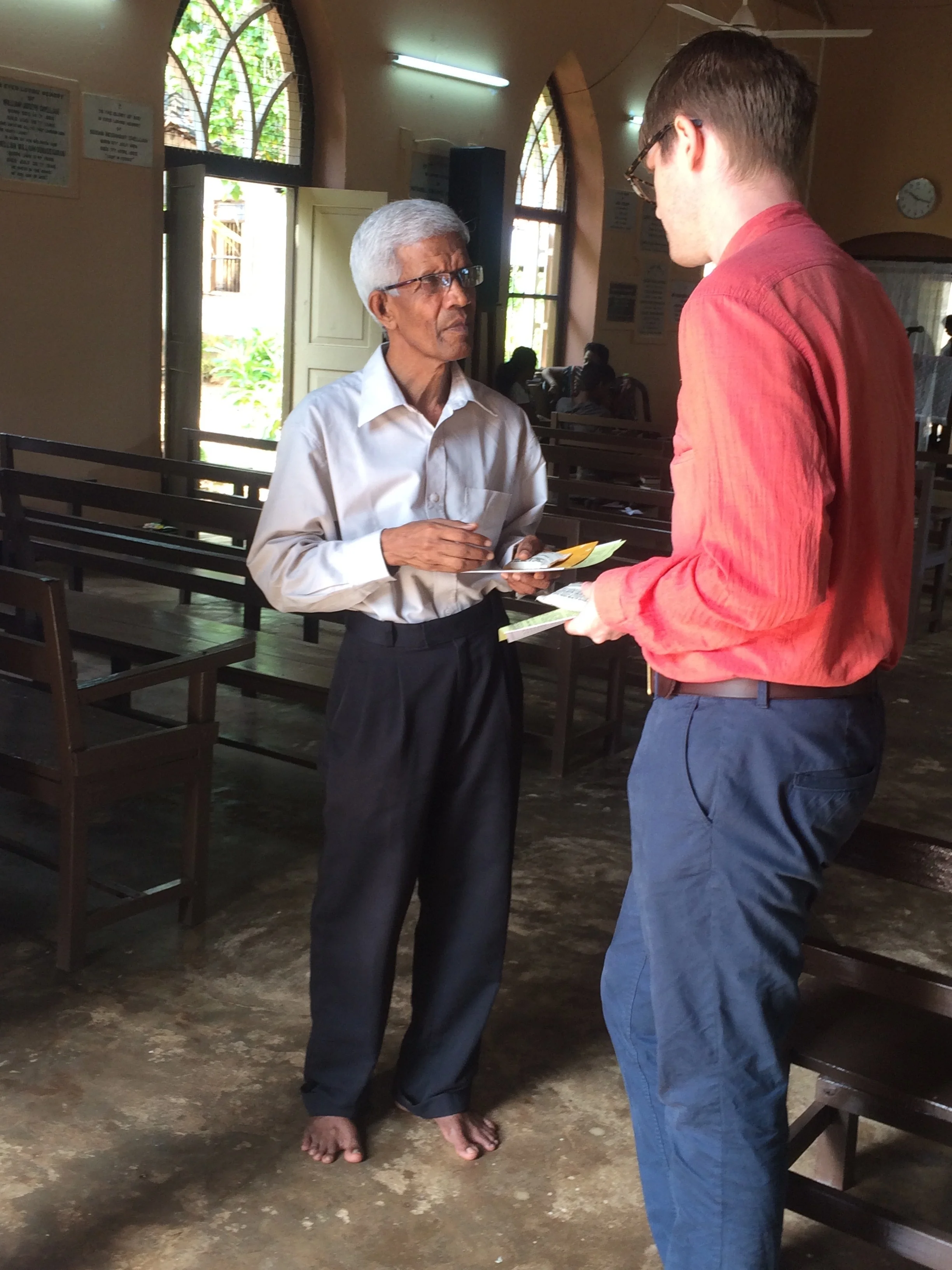 Mirusha Kumarakulasingham (right) distributing project information at Manipay church. Photo Credit: Mark E. Balmforth