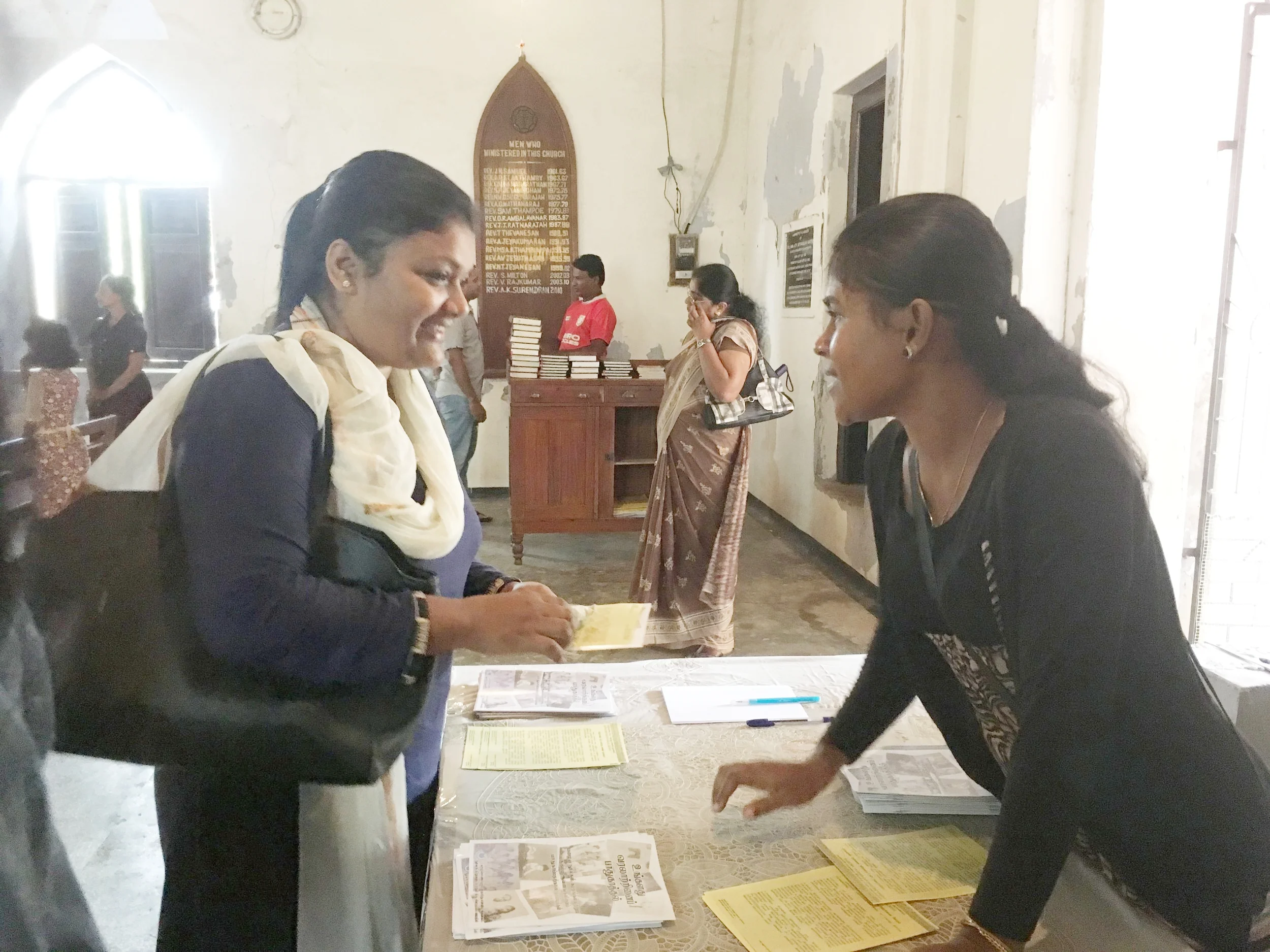 Kirubalini Stephan (center) and Henria Aton (right) distributing project information at Manipay church. Photo Credit: Mark E. Balmforth